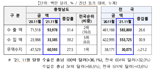 또 “올해 충남의 무역수지 흑자액은 특히 전국 무역수지 흑자액 301억 달러의 2배 이상 규모로, 대한민국 무역 흑자를 충남이 견인 중임을 다시 한 번 입증했다”고 덧붙였다.