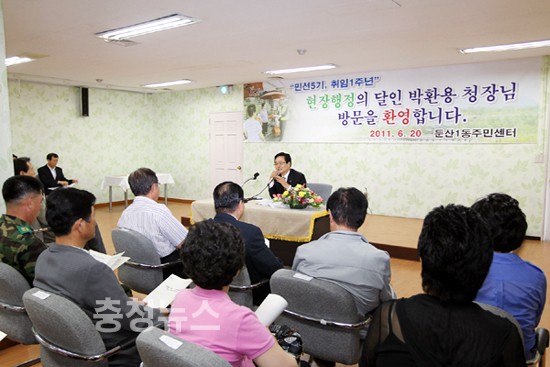 박환용 서구청장은 20일 동순방 첫날, 둔산1동을 시작으로 민선5기 1주년 성과보고 및 구정운영 방향 제시하고, 구정에 대한 다양한 의견과 지역 현안 등 건의사항을 수렴해 구정에 적극 반영할 예정이다.