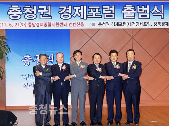 21일, 충남 천안 충남경제종합지원센터 컨벤션홀에서 염홍철 대전시장, 안희정 충남도지사, 이시종 충북도지사, 송인섭 대전경제포럼 대표, 김용웅 충남경제포럼 대표, 이상훈 충북경제포럼 대표 등 200여명이 참석한 가운데 충청권경제포럼 출범식을 갖고 제1차 포럼이 열렸다.