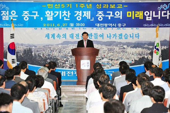 대전 중구(구청장 박용갑)는 27일 구청 대회의실에서 250여명의 직원들이 참석한 가운데 민선5기 1년 성과 및 앞으로 추진할 구정 주요시책에 대한 보고회를 개최하고 제2의 중구부흥을 다짐했다.