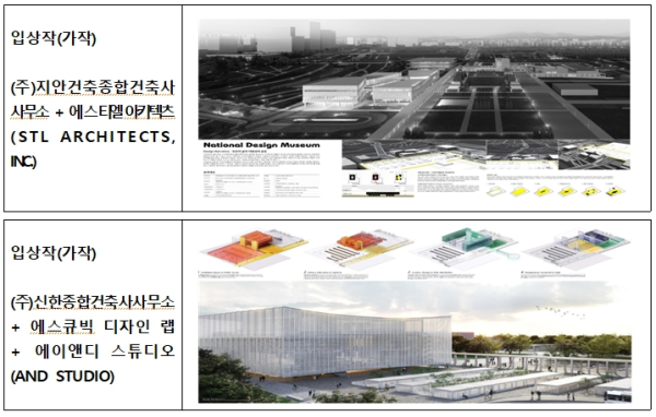 행복청은 2021년 9월부터 2021년 12월까지 3개월 동안 국립디자인박물관 국제설계 공모를 추진하여 총 24개의 작품을 접수하였고, 1월 12일(수) 1차 심사에서 5개의 작품을 선정하였다.