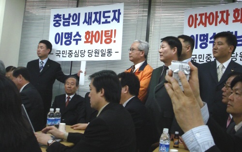 이날 기자회견장에는 충남도지사 후보 출정식을 방불케하는 분위기였으며, 중심당 주요 당직자와 이부총장의 지지자들이 대거 참석 힘을 실어 주었다.