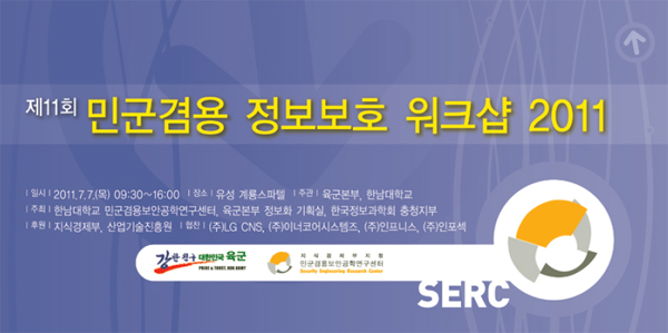 한남대 민군겸용보안공학연구센터(소장 이극, SERC)는 육군본부와 공동주최로 ‘제11회 민군겸용 정보보호 워크숍 2011’을 오는 7일 오전 9시 30분부터 오후 4시까지 대전 유성 계룡스파텔에서 개최한다.
