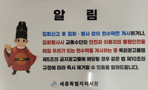 [충청뉴스 최형순 기자] 세종특별자치시(시장 이춘희)가 이달 말부터 어진동 정부청사 일원 집회주요 장소에 집회 현수막 근절을 위한 안내판 56매(90㎝×60㎝)를 부착하고 불법집회현수막 근절에 나선다.