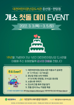 이벤트는 다음달 3일부터 5일까지 3일간 어린이장난감도서관 둔산점과 판암점에서 진행된다. ▲이용수기 공모전 시상식 ▲장난감 무료 수리 ▲축하나무 꾸미기 ▲인스타그램 축하 댓글 달기 이벤트와 함께 ‘첫돌 감사 Day 기념품’ 등을 제공한다.