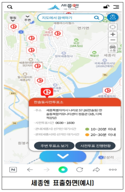 유권자는 세종엔에서 관내 읍면동 사전투표소 22곳의 ▲사전투표소(관내·관외) 혼잡도 ▲가까운 투표소 ▲투표율 등을 확인할 수 있다.