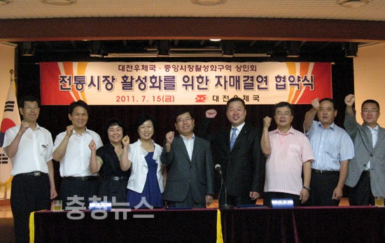 대전우체국(국장 정연석)이 15일 오전대전우체국 7층 회의실에서 중앙시장 상인회와 전통시장 활성화를 위해 자매결연을 맺는 협약식을 가졌다.