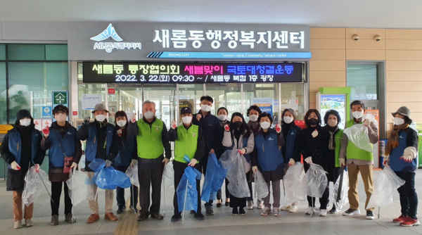 [충청뉴스 최형순 기자] 세종특별자치시 새롬동(동장 김산옥)이 22일 통장협의회, 동 관계자 등 20여명이 참여한 가운데 새봄맞이 국토대청결 운동을 실시했다.