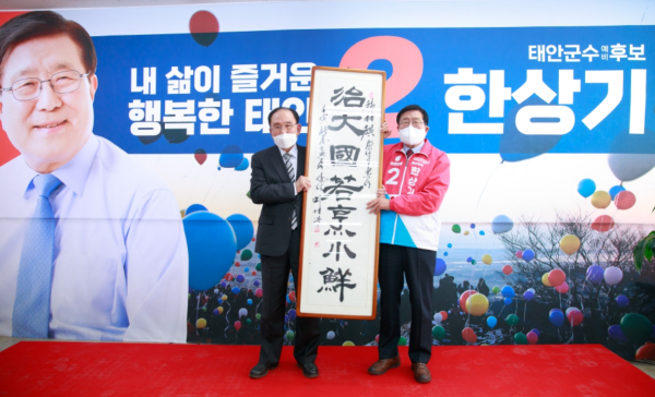 한상기 후보의 오랜 지인 홍욱기 전 태안고등학교 교장선생은 한 후보에게 치대국약팽소선(治大國若烹小鮮)이라고 쓰인 글귀 한점을 전달했다. 노자의 도덕경에 나오는 말로서 큰 나라를 다스리는 것은 작은 생선을 굽듯이 조심해야 한다는 뜻이다.
