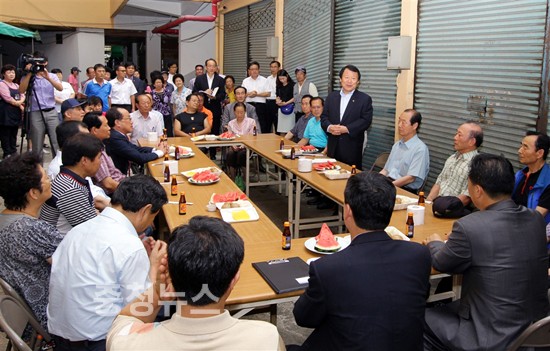 ▲ 염홍철 대전시장이 인동시장 상인들과 의견을 교환하고 있다.