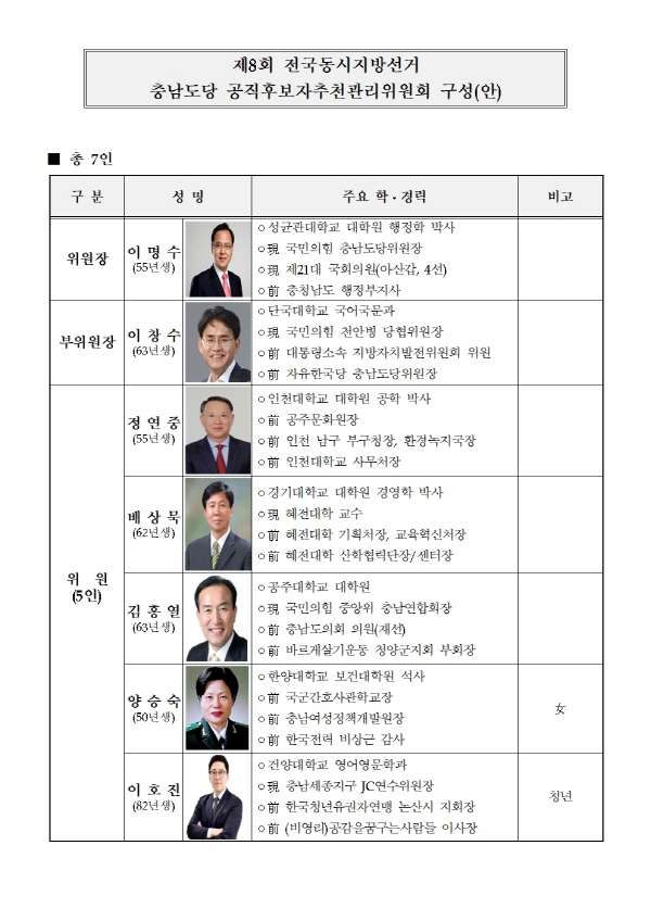 [충청뉴스 조홍기 기자] 국민의힘 충남도당(위원장 이명수)은 제8회 전국동시지방선거 충남도당 공천관리위원회(비례대표 공천위원회 포함)를 구성했다.