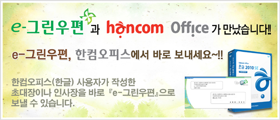 충청우정청 관계자는 “종전에‘e-그린우편’을 보낼 때는 우체국 창구를 방문하거나 인터넷우체국에 접속해야만 했다”면서 “앞으로는 한컴오피스에서 바로 인터넷우체국에 접속하면 고객이 작성한 편지를 여러 사람에게 편리하게 보낼 수 있게 됐다”고 말했다.