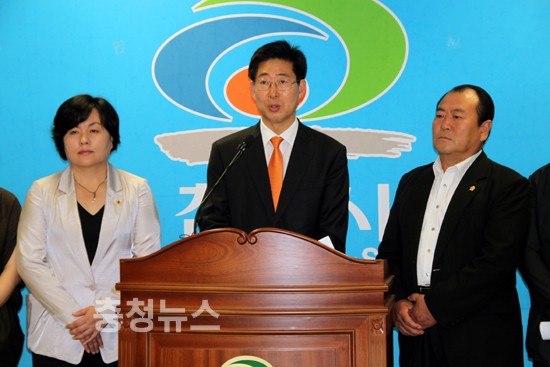 천안 민주당 국회의원과 10여명의 시·도 의원이 29일 천안시청에서 천안~청주공항 수도권 전철 직선노선안과 기존 노선안, 양 노선에 대해 예비타당성 조사 신청을 국토해양부에 촉구하는 성명서를 발표했다.
