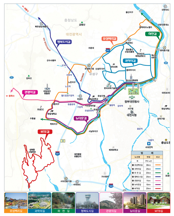 올해부터 1단계 사업을 시작해 ‘유성백리길’, ‘과학의 길’, ‘MTB길’을 조성하고 2012년 2단계는 ‘뉴타운길’, ‘행복도시길’을 2013년 3단계는 ‘관광의 길’, ‘하천길’ 등 7개 노선 총 연장157㎞를 2013년까지 조성할 계획이다.