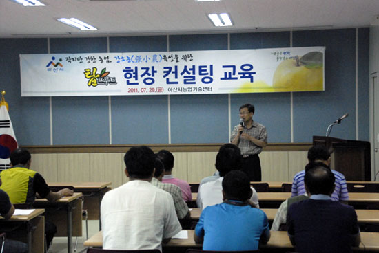 아산시(시장 복기왕)는 강소농 육성을 위한 탑프루트 시범단지 현장 컨설팅교육을 지난달 29일 아산시농업기술센터(소장 유재범)에서 60여명의 탑프루트 회원이 참석한 가운데 실시했다.