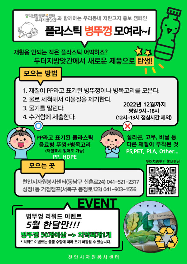 천안시자원봉사센터 관계자는 “5월에는 병뚜껑 50개 이상을 제출하면 업사이클링 제품인 치약짜개와 교환할 수 있는 행사를 진행할 예정이니, 천안시민 여러분들의 많은 관심과 참여를 바란다”고 말했다.