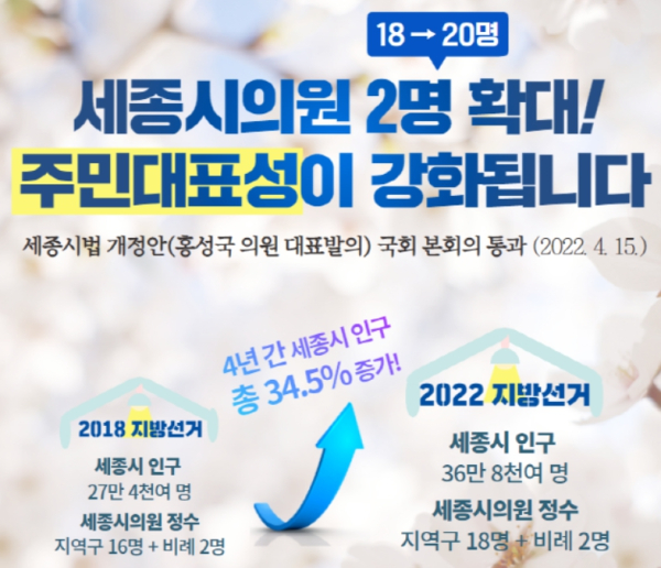 세종시 인구는 2018년 지방선거 당시 27만 4092명에서 4년 만에 34.5% 증가한 36만 8582명으로 성장했다. 의원 정수가 인구 증가를 따라가지 못하면 지방의원의 과대대표 현상이 발생한다.