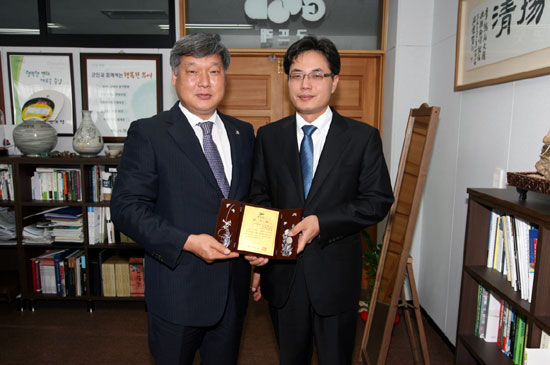 ▲ 이용우 군수(왼쪽)와 유병진 변호사(오른쪽)가 기념촬영을 하는 모습