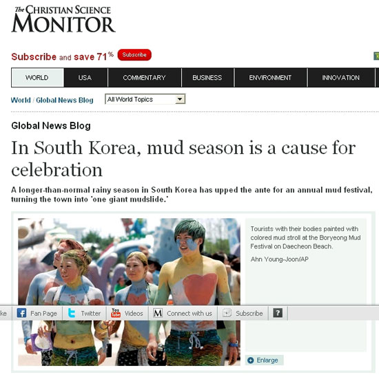 미국 CSM지 보령머드축제 보도…스페인 '라 토마티나'보다 더 유명한 축제