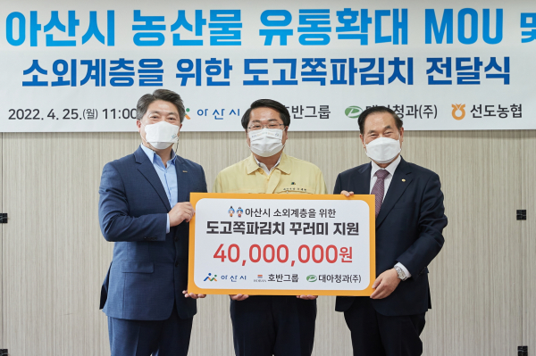 한편, 이날 대아청과와 모 기업인 호반그룹은 아산시 독거노인 등 소외계층에 4,000만 원 상당의 3kg 도고쪽파김치 1,285세트를 기부했다.