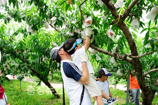 ▲ 아버지와 아이가 힘을 합쳐 복숭아 수확체험을 하고 있다.