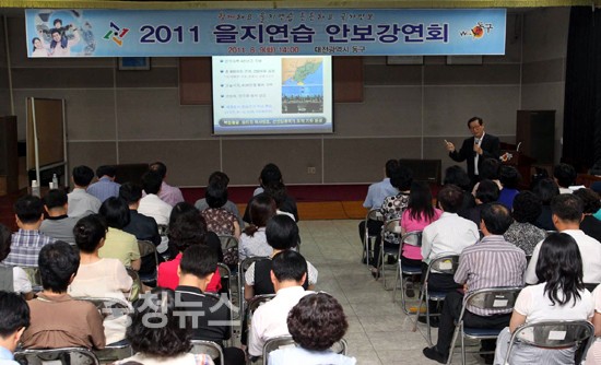 대전 동구(구청장 한현택)는 9일 구청 대회의실에서 ‘2011 을지/프리덤가디언 연습’의 성공적인 추진과 공무원들의 안보의식을 고취를 위한 안보 강연회를 개최했다.