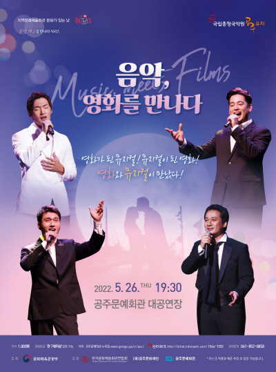 [충청뉴스 공주 = 조홍기 기자] 공주문예회관은 5월 문화가 있는 날을 맞아 영화와 뮤지컬이 만나는 ‘음악, 영화를 만나다’ 공연을 5월 26일(목) 오후 7시 30분 공주문예회관 대공연장에서 선보인다.