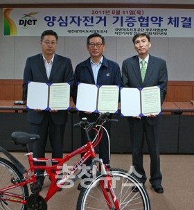 11일 '양심자전거 기증 협약식' 갖고 80대 자전거 기증 ▲ 사진왼쪽부터 원성연 대전본부장,김창환 사장, 성한용 유성지점장 국민체육진흥공단 경주사업본부 유성지점(지점장 성한용), 자전거 사랑 전국연합대전본부(대전본부장 원성연)는 11일 대전도시철도공사(사장 김창환)에서 '양심자전거 기증 협약식'을 갖고 80대의 자전거를 공사에 기증했다. 이로써 대전도시철도 22개역에는 모두 5백44대의 자전거가 비치돼 시민들의 근거리 이동편의를 돕게 됐다. 저작권자 © 충청뉴스 무단전재 및 재배포 금지 이재용 기자 다른기사 보기 기사가 마음에 드셨나요? 충청뉴스 좋은 기사 후원하기 1,000원 3,000원 5,000원 10,000원 30,000원 50,000원 직접입력 비회원 약관동의하기 ※ 소중한 후원금은 더 좋은 기사를 만드는데 쓰겠습니다.