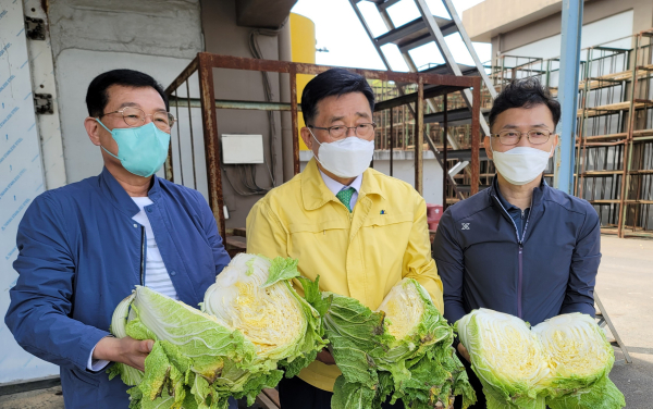 [충청뉴스 최형순 기자] 한국농수산식품유통공사 김춘진 사장은 6일 최근 배추 가격 상승으로 가락동 도매시장에 상장 판매 중인 겨울배추 점검을 위해 전남 무안 소재 영진농산 비축창고를 찾아 배추의 품질과 보관현황 등을 점검했다.