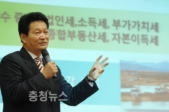 이에 앞서 송 시장은 대강당에서 도청 직원을 대상으로 '벽을 문으로'라는 주제로 특강에서는 대한민국의 지속가능한 발전 방안에 대해 특강을 실시했다. 특강 중에는 뽀로로 캐릭터를 예로 들며 고부가가치 산업 강화 필요성을 강조해 호응을 이끌어내기도 했다.