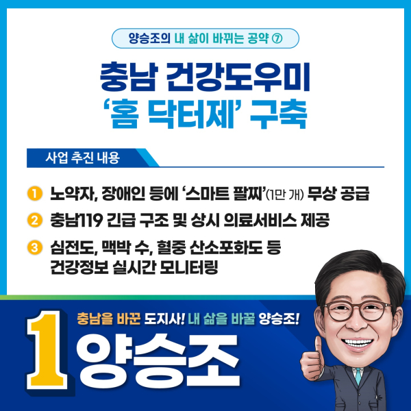 양승조 후보는 충남 건강도우미 ‘홈닥터제’를 도입해 의료취약계층의 의료서비스 접근성을 높이겠다는 계획이다.