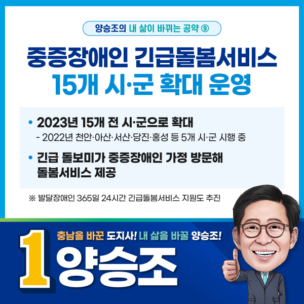 양승조 후보는 “24시간 긴급돌봄서비스를 모든 시·군으로 확대 시행해 긴급돌봄이 필요한 중증발달장애인에게 안전하고 전문적인 서비스를 제공할 것”이며, “발달장애인 보호자에게는 쉼표 같은 휴식을 드릴 것”이라고 밝혔다.