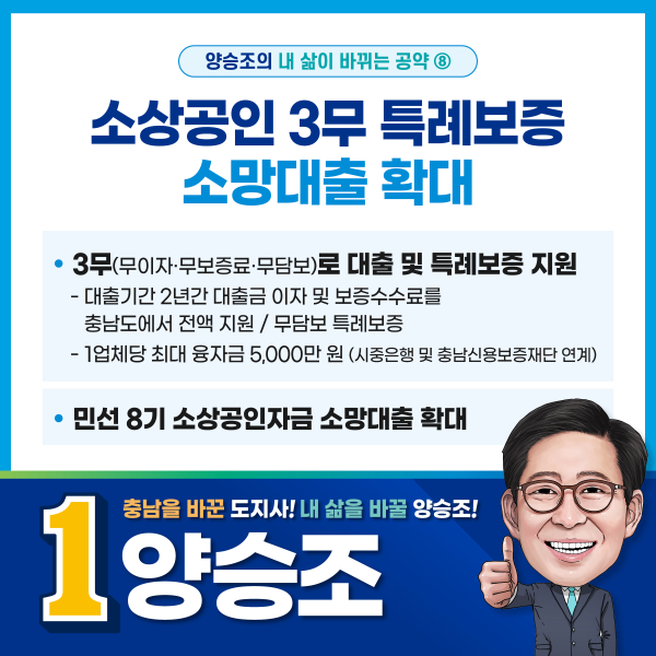 양 후보는 먼저 “코로나19로 고통받고 있는 소상공인과 자영업자의 빠른 회복을 지원하기 위해 무이자·무담보·무보증료 소망대출 3무 특례보증을 추진하겠다”고 밝혔다.