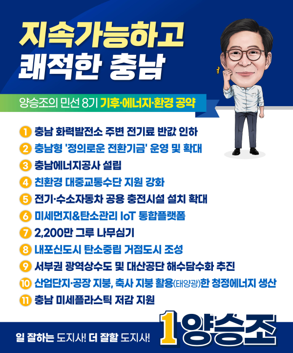 양승조 후보는 ▲충남형 ‘정의로운 전환기금’ 규모 10배 확대 ▲충남에너지공사 설립 등을 대표 공약으로 내세웠다.