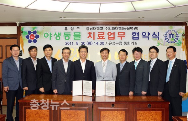 대전 유성구(구청장 허태정)는 30일 구청 중회의실에서 양 기관 관계자 10명이 참석한 가운데 충남대 수의과대학과 야생동물 치료 업무에 대한 협약을 체결했다.