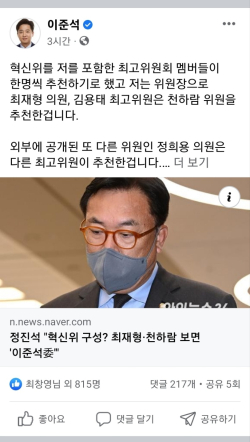 이에 이 대표는 “당의 최다선이자 어른에 정치선배를 자처하시면서 선제적으로 우리 당내 인사 몇 분 저격하셨습니까. 대표, (정미경) 최고위원, 최재형 의원까지”라고 꼬집었다.