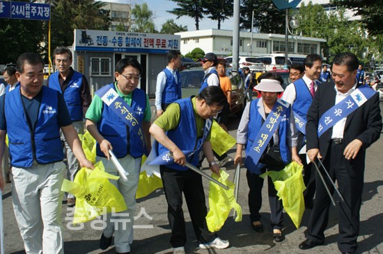 선진당은 이날 오후 3시부터 2시간여 동안 대전역 광장에 집결해 중앙시장을 거쳐 으능정이 거리까지 도보로 이동하며 길가의 휴지를 줍고, 휴일 어지럽혀진 쓰레기더미들을 정리했다.