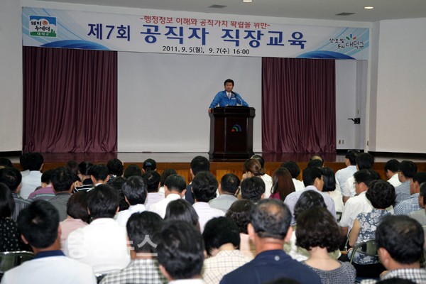 대전 대덕구(구청장 정용기)는 지난 5일과 오는 7일 양일간 구청 대강당에서 전 직원이 참석한 가운데 ‘공직사회 유연근무제 발전방안’이라는 주제로 제7회 공직자 직장 교육을 실시한다.