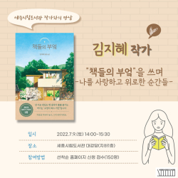 [충청뉴스 최형순 기자] 세종시립도서관은 7월 9일 김지혜 작가와의 만남을 개최한다.