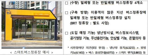 기존 버스정류장에서 제공 중인 버스 도착시간 안내 서비스 뿐 아니라 냉난방 시설, 안심벨‧공기청정 기능, 온열의자 등을 추가하여 시민이 안전하고 편리하게 버스정류장 이용할 수 있는 환경을 조성할 계획이다.