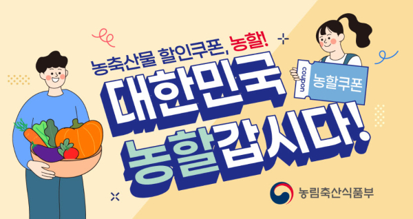 [충청뉴스 최형순 기자] 농림축산식품부(장관 정황근)와 한국농수산식품유통공사(사장 김춘진)는 코로나19로 위축된 농축산물 소비촉진과 국민 가계부담 완화를 위해 추경예산 390억원을 확보해 하반기에도 ‘농축산물 할인쿠폰 사업(대한민국 농할갑시다, 농할쿠폰)’을 추진한다.