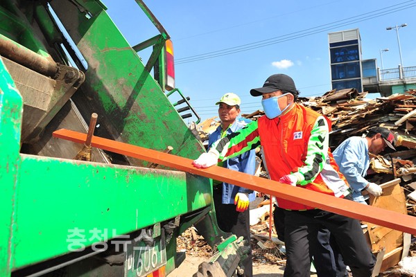 ▲ 박용갑 중구청장이 안영동 대형폐기물 처리장에서 일손을 돕고 있다.