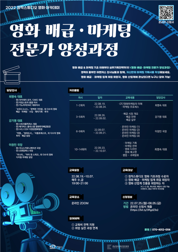 [충청뉴스 박동혁 기자] 충남 천안시가 지원하고 충남정보문화산업진흥원(이하 진흥원)이 운영하는 천안시 창작스튜디오가 ‘영화 배급·마케팅 전문가 과정’ 수강생을 모집한다.