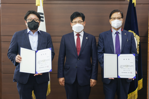 (왼쪽부터)박형준 변호사, 정도희 의장, 주영진 교수가 고문 위촉 기념사진을 찍고 있다/천안시의회 제공