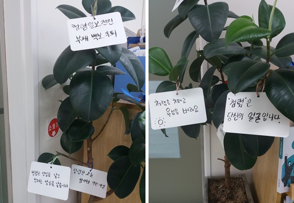 회원들이 깨끗한 공직문화 분위기 조성에 노력하고자 카드를 한 곳에 걸어둠으로써 충남동부의 희망나무가 더 풍성해졌다.