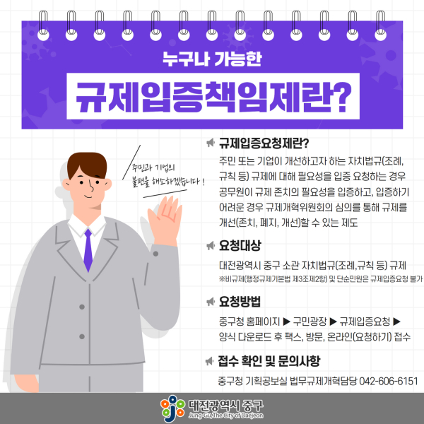 요청 방법은 중구청 누리집 ‘구민광장’에 게시된 행정규제의 규제입증요청 항목에서 ‘규제입증요청서’를 작성하여 방문, 우편, 팩스로 신청 가능하며, 올해 7월부터는 보다 쉽게 접근할 수 있도록 온라인 창구를 개설해 더욱 활발하게 추진하고 있다.