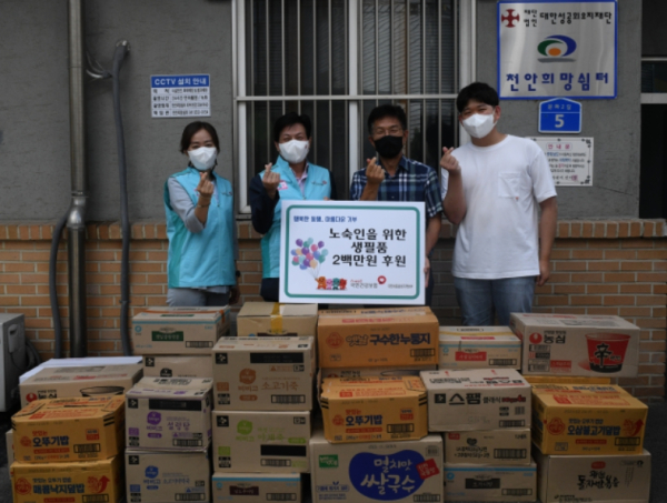 최근 지속되는 폭염 속에 어려움을 겪고 있는 거리 노숙인들을 위해 노숙인 자립지원시설인 천안희망쉼터에 컵라면, 간편식 등 2백만 원 상당의 생필품을 후원하였다.