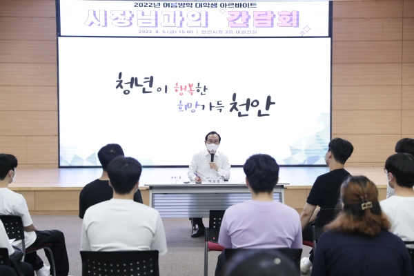 [충청뉴스 박동혁 기자] 박상돈 천안시장은 5일 시청 대회의실에서 여름방학 대학생 아르바이트 근무 학생들을 대상으로 ‘시장님과의 간담회’를 개최해 청년들의 목소리를 경청했다.