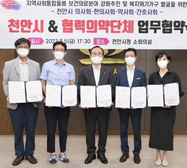 시는 지난 5일 시청 소회의실에서 천안시 의사회·한의사회·약사회·간호사회 4곳 의약단체와 지역사회통합돌봄 보건·의료분야 강화 및 복지위기가구 발굴과 지원을 위한 업무협약을 체결했다.