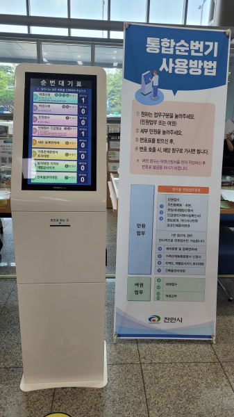 [충청뉴스 박동혁 기자] 충남 천안시는 시청 종합민원실에 여러 민원 서비스 번호표를 하나의 키오스크에서 받을 수 있는 ‘스마트 통합순번대기시스템’을 설치했다.